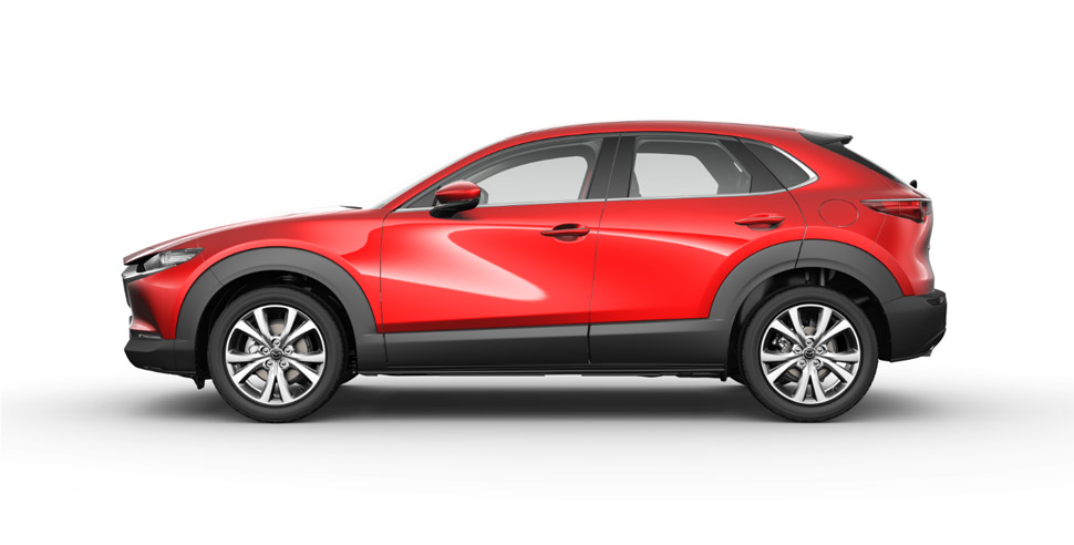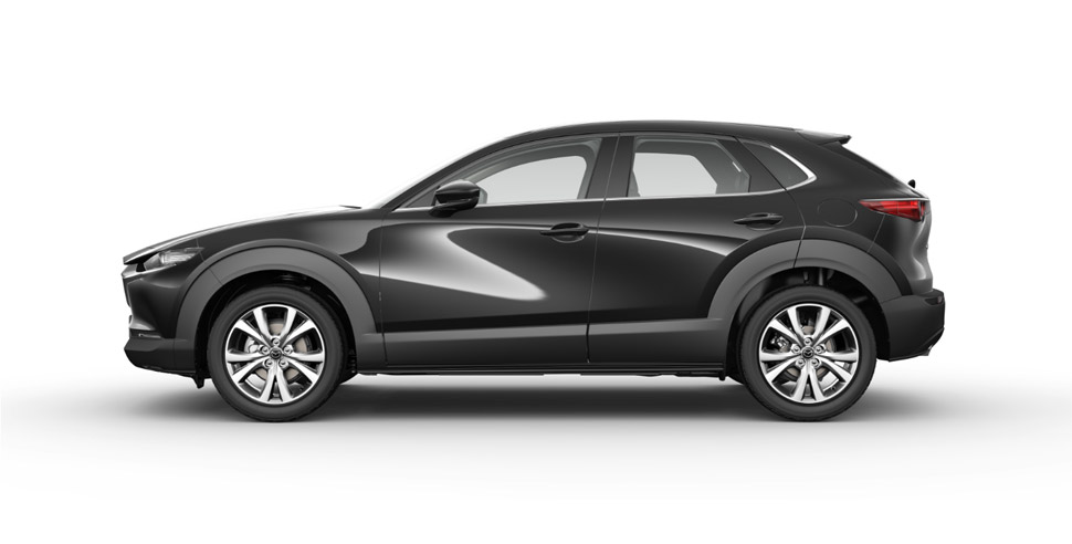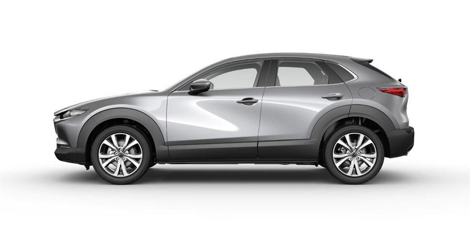 Ukuran dimensi tersebut membuat Mazda CX-30 tampak samping terlihat compact. Aura SUV terpancar dari warna hitam yang mengeliling mobil mulai dari bumper depan menyambung ke fender hingga belakang. Lekukan pada fender membuatnya terlihat berotot sehingga kuat akan aura SUV. Kemewahan coba dipancarkan melalui lis krom yang dimulai dari ujung jendela depan hingga ke pilar D.